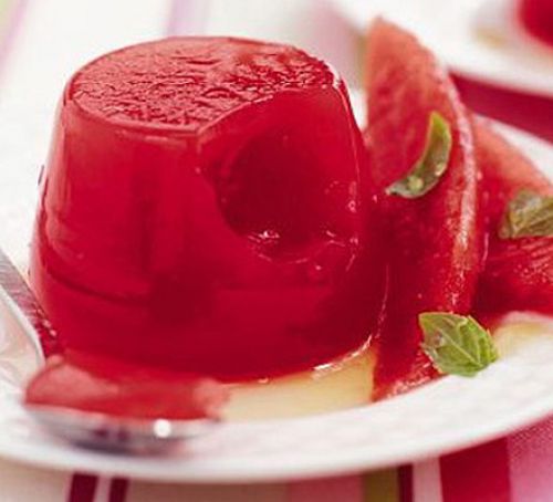 to drizzle Blitz together the watermelon with the juice of the limes and caster sugar until completely juiced. Push the juice through a sieve into a measuring jug. Measure the amount of juice you have and soak as many leaves of gelatine as you need, using the ratio of 1 leaf of gelatine per 200ml. Dissolve the soaked gelatine in a little hot water from the kettle and add to the watermelon juice. Pour the juice into small moulds and leave to set overnight. Unmould the jellies and serve alongside bite-sized chunks of watermelon scattered with chopped mint and drizzled with honey